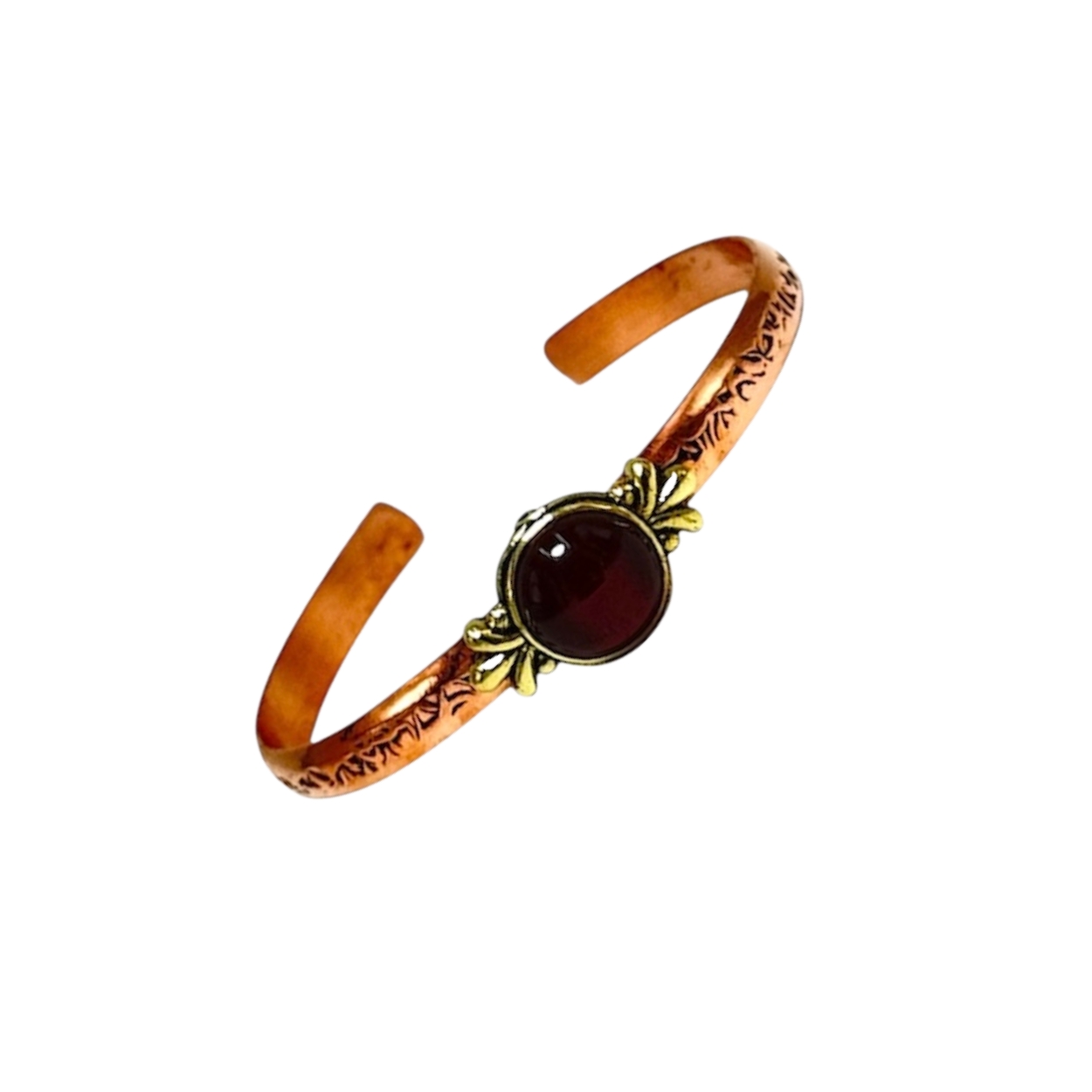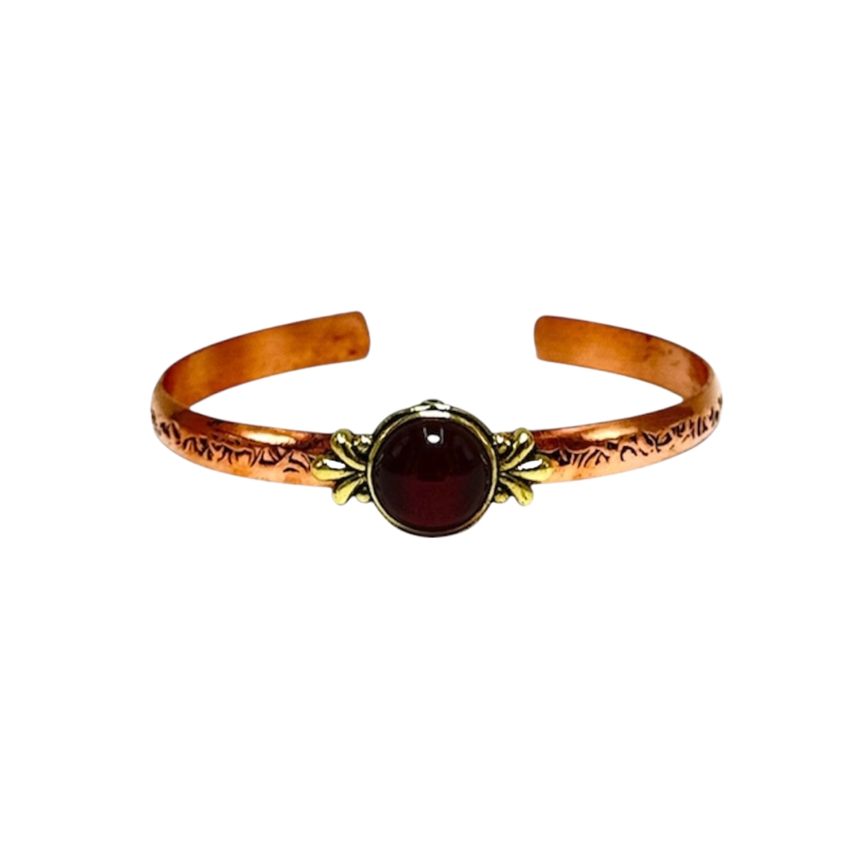 Madeni bakırdan, kuyumcu işçiliğiyle üretilmiş, Akik taşı ile süslenmiş ve ayarlanabilir tasarımıyla konforlu kullanım sunan şık bileklik.