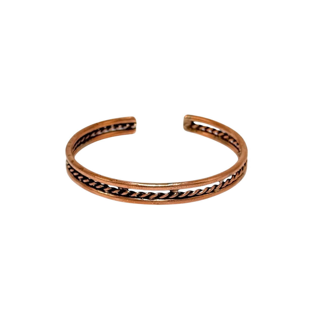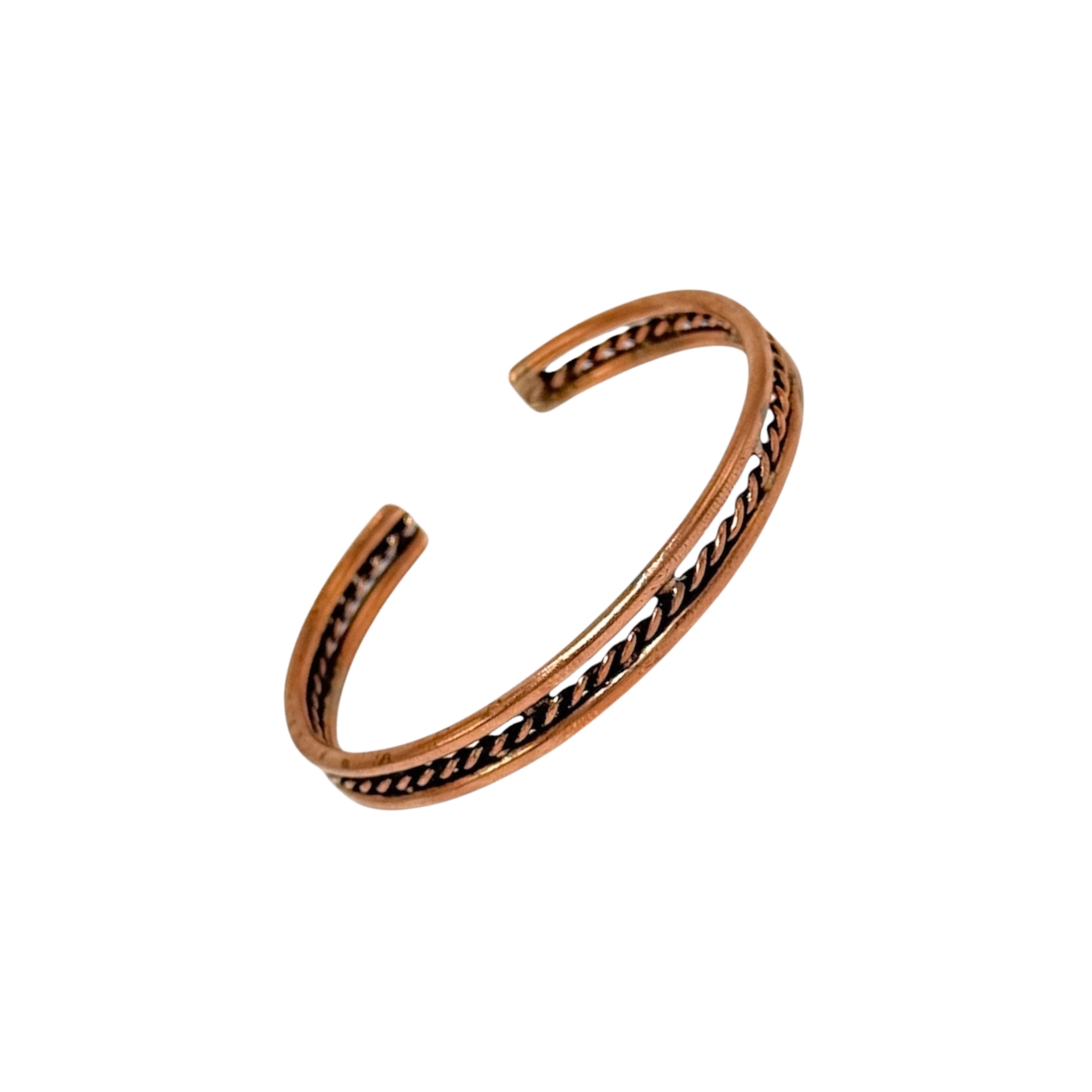 Madeni bakırdan, kuyumcu işçiliğiyle üretilmiş ve ayarlanabilir tasarımıyla konforlu kullanım sunan şık bileklik.
