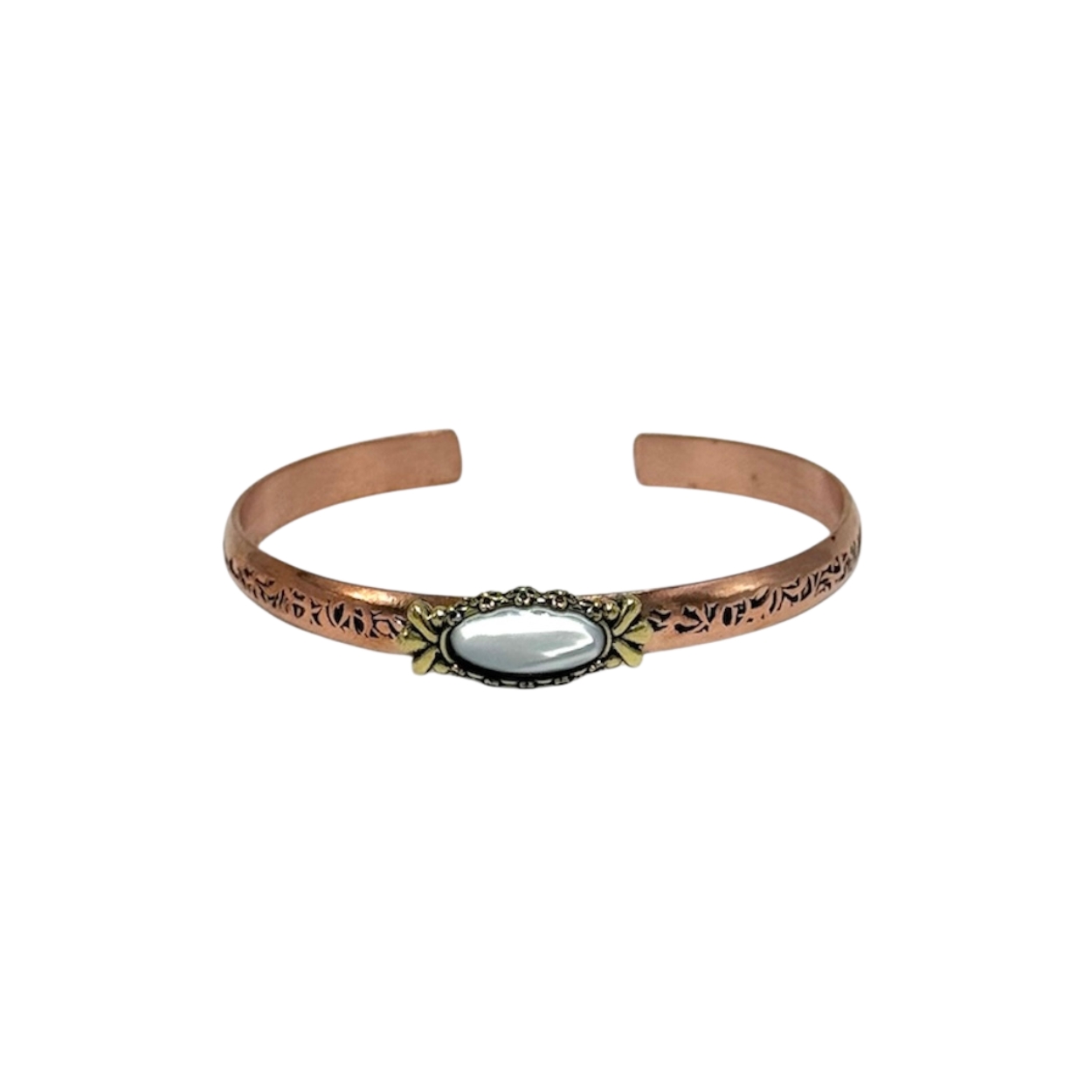 Madeni bakırdan, kuyumcu işçiliğiyle üretilmiş, Sedef taşı ile süslenmiş ve ayarlanabilir tasarımıyla konforlu kullanım sunan şık bileklik.