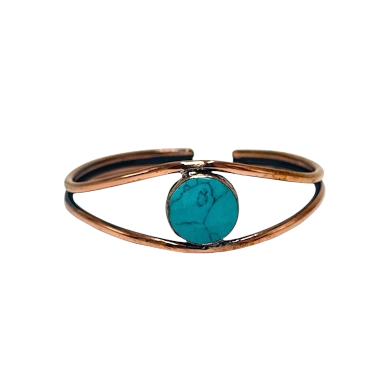 Madeni bakırdan, kuyumcu işçiliğiyle üretilmiş, Turkuaz taşı ile süslenmiş ve ayarlanabilir tasarımıyla konforlu kullanım sunan şık bileklik.