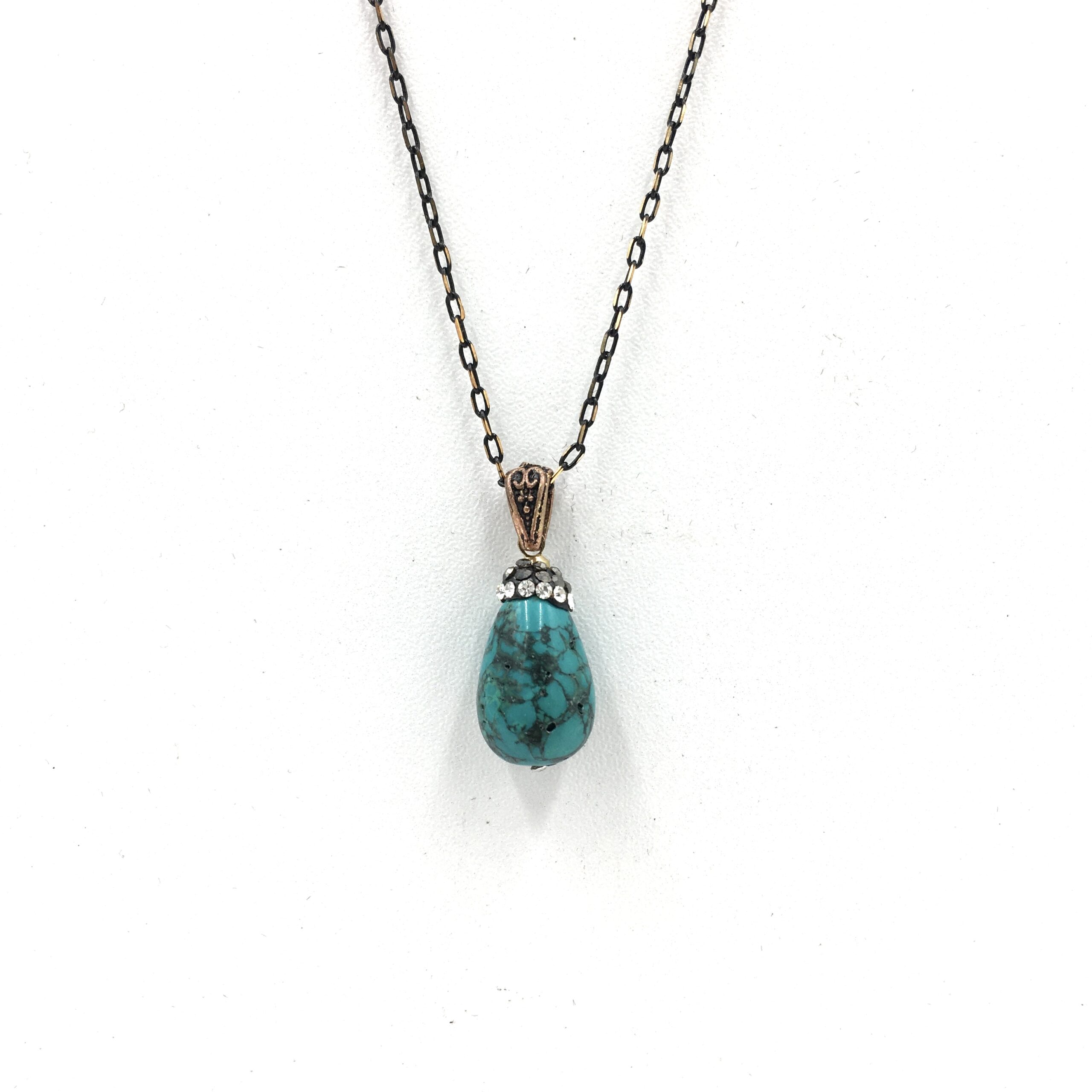 Turkuaz, markazit ve takı macunu kullanılmıştır, şekil ve renk tonlarında küçük farklılıklar oluşabilir, zincir uzunluğu 45 cm.