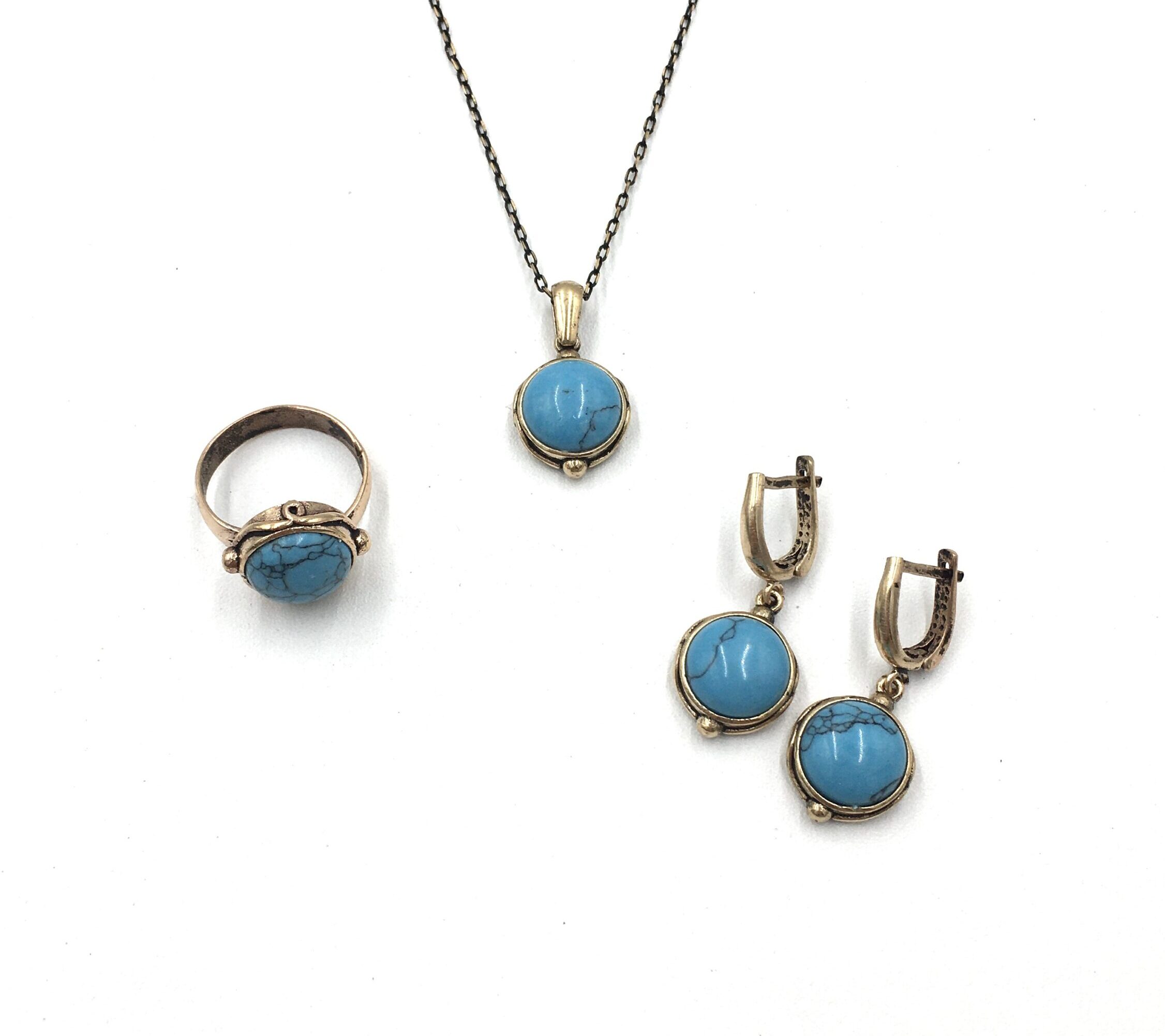 Madeni bronz, sıkma turkuaz ,yüzüğü parmağa göre ayarlanabilir, kuyumcu işçiliğiyle üretilmiştir, zincir uzunluğu 45cm.