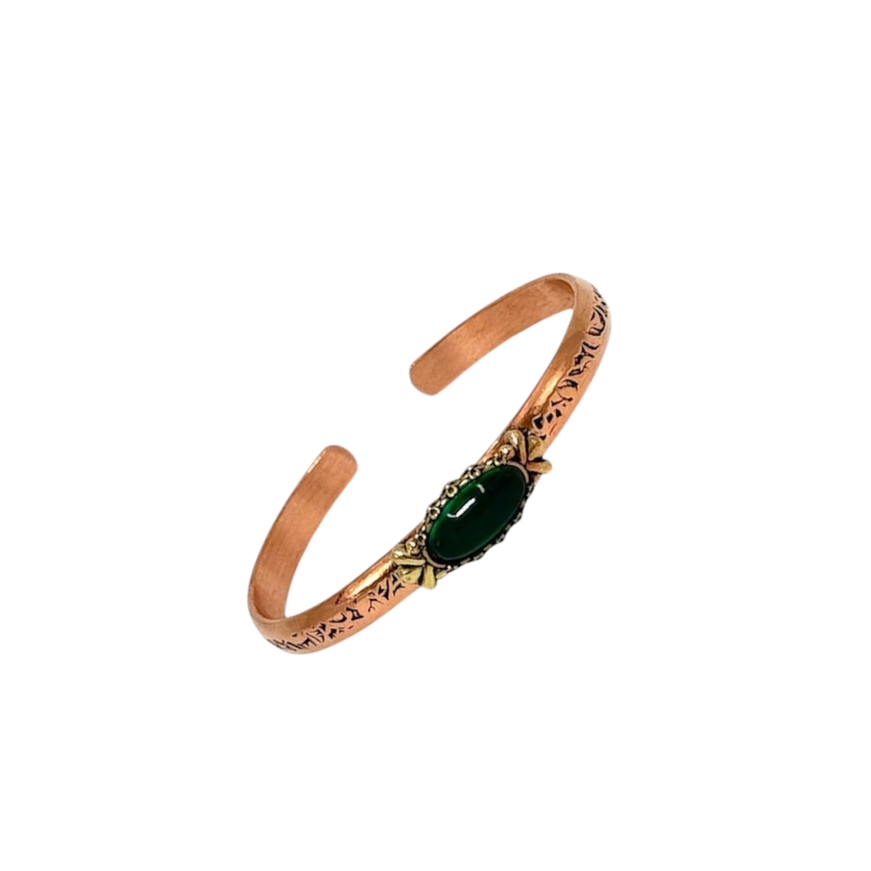 Yeşil Akik Doğal Taş Bakır bilekliklerimiz, doğal ve kaliteli bakırdan üretilmiş olup, el işçiliği ile şık ve geleneksel desenlerle bezenmiştir. Her bileğe uygun ayarlanabilir yapısı sayesinde rahatlıkla kullanılabilir. Günlük kullanım ve özel günlerde zarif bir aksesuar olarak tercih edilebilecek bu bileklikler, müşterilerinizin tarzını tamamlayacak.